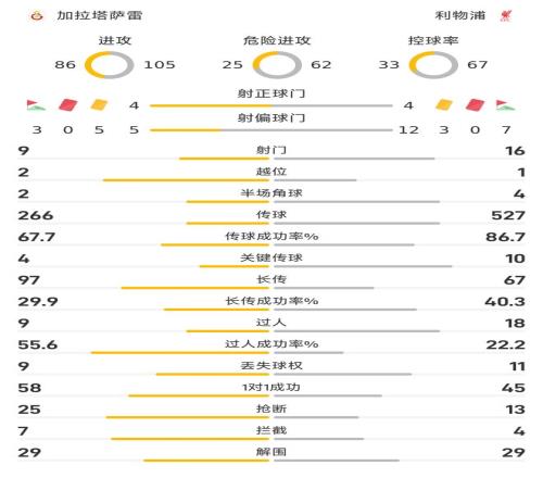 縱觀全場比賽,利物浦在射門方面以16-9明顯高出對手,但其中射門方面雙方皆是4次平分秋色。在控球率方面,利物浦則以67%-33%明顯高出對手。