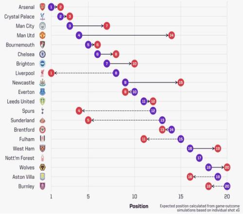 雷速體育10月1日宣 今日,國外知名數(shù)據(jù)機(jī)構(gòu)公布了一項(xiàng)英超聯(lián)賽前六輪預(yù)期積分排名的數(shù)據(jù)結(jié)論,其中目前位列榜首的利物浦期望排名僅位列第八,而排名第二的阿森納期望排名是英超第一,實(shí)際排名第四的熱刺預(yù)期排名僅為英超第12。