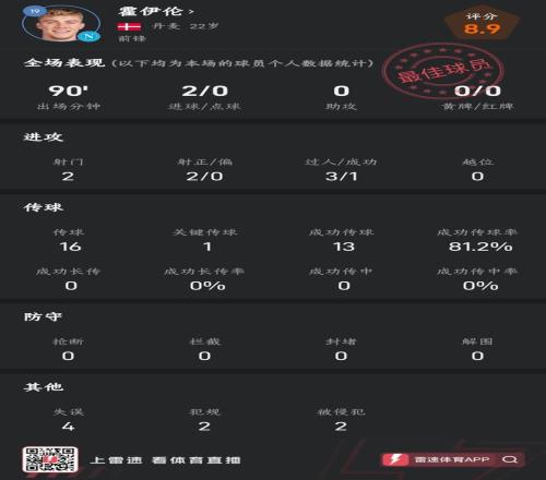 雷速體育10月02日宣 25-26賽季歐冠聯(lián)賽階段第二輪,意甲冠軍那不勒斯坐鎮(zhèn)主場2-1戰(zhàn)勝葡超冠軍葡萄牙體育,從而奪取本賽季歐冠首場勝利。那不勒斯能斬獲勝利,丹麥前鋒霍伊倫發(fā)揮了決定性作用,包辦球隊(duì)全部2粒入球。