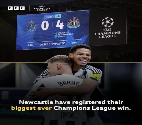 據統(tǒng)計,這是紐卡斯爾聯(lián)隊史在歐冠賽事中取得的最大比分差距的勝利。