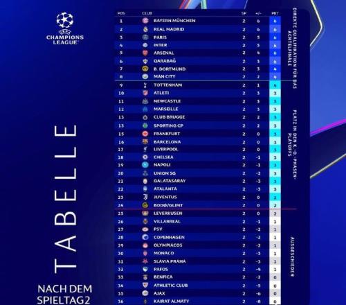 北京時間10月2日,歐冠聯(lián)賽階段第2輪比賽全部結束。本輪過后,最新積分榜也發(fā)生了巨變。