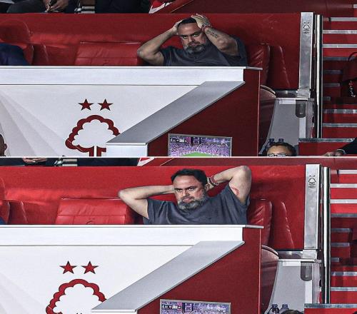 球隊(duì)老板希臘船王馬里納基斯在看臺(tái)上親眼目睹了球隊(duì)再度收獲一場(chǎng)失利后,在看臺(tái)上神情顯得格外猙獰,再度露出死亡凝視。