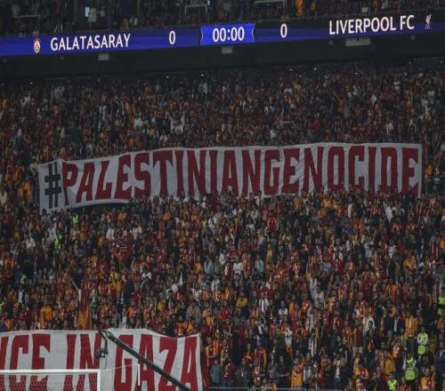 加拉塔薩雷球迷在對(duì)陣?yán)锲謺r(shí),打出了支持巴勒斯坦的標(biāo)語(yǔ)