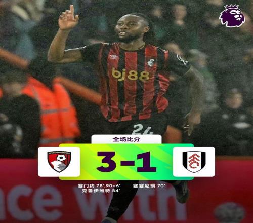 第78分鐘,伯恩茅斯扳平比分!塞門約在左側(cè)強(qiáng)行帶球過人,突入禁區(qū),小角度低射,皮球從門將襠下穿過去,鉆入球門!這粒進(jìn)球完全是依靠個(gè)人能力!6分鐘后,伯恩茅斯再進(jìn)一球!克魯伊維特轟出一腳無解世界波!伯恩茅斯反超比分!第96分鐘,伯恩茅斯又進(jìn)球了!依然是塞門約,他在禁區(qū)內(nèi)包抄推射打進(jìn),殺死比賽!最終的比分定格為3-1,伯恩茅斯逆轉(zhuǎn)擊敗富勒姆!
