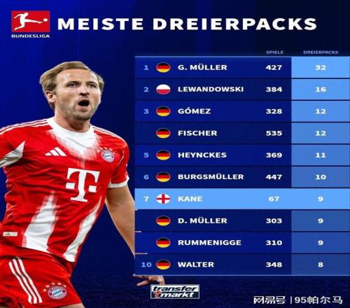 對(duì)標(biāo)姆巴佩,參照梅西,32歲的凱恩并沒(méi)有辜負(fù)“大英帝星”的頭銜,以至于兩屆德甲金靴的履歷并不能完全匹配星光,或者說(shuō)他在德甲真正意義上實(shí)現(xiàn)了降維打擊。比如他只用了67場(chǎng)比賽就完成了9次帽子戲法,他只用了104場(chǎng)就完成拜仁百球里程碑,并成為21世紀(jì)最快為五大聯(lián)賽俱樂(lè)部打進(jìn)百球的球員。