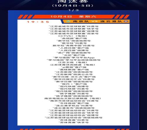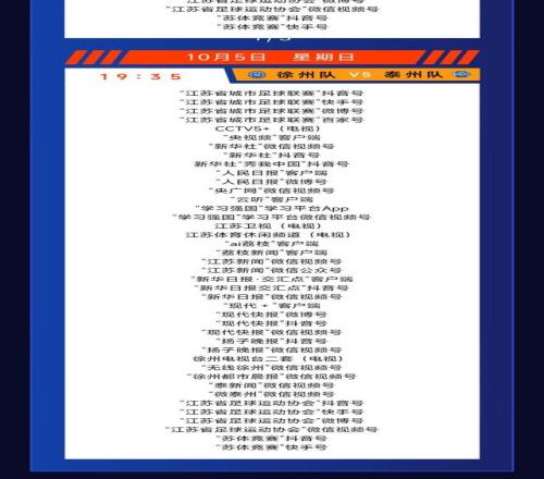 現(xiàn)代快報訊(記者 王衛(wèi))10月4日、5日、7日、8日,蘇超八強(qiáng)淘汰賽將在國慶中秋雙節(jié)假期期間激戰(zhàn)四場。10月3日,蘇超官方微信公眾號發(fā)布了淘汰賽(10月4日-5日)轉(zhuǎn)播計劃表,現(xiàn)代快報記者注意到,10月4日晚南京對陣連云港、10月5日晚徐州對陣泰州的比賽,CCTV5+(電視)均轉(zhuǎn)播。記者了解到,這是央視電視端首次直播蘇超賽事。