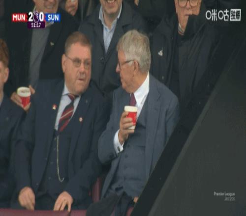 第52分鐘,兩球領先,弗格森爵士在看臺和朋友交談甚歡