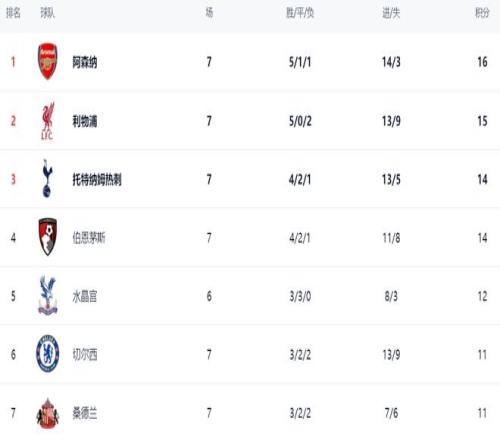 在積分榜上,贏球的阿森納登上了榜首位置。阿森納5勝1平1負,拿到了16分。利物浦這輪落敗,依然是15分,排名第2。熱刺以14分排名第3。伯恩茅斯這匹黑馬也是14分,排名第4。水晶宮以12分排名第5。切爾西和桑德蘭都是11分。曼城和曼聯(lián)則都是10分。