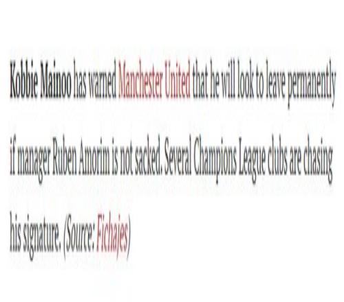 人們很難想象梅諾會(huì)有機(jī)會(huì)在下輪做客安菲爾德的英超「雙紅會(huì)」里首發(fā),預(yù)計(jì)他將繼續(xù)板凳坐穿。西班牙「Fichajes轉(zhuǎn)會(huì)網(wǎng)」稱,梅諾已經(jīng)向曼聯(lián)發(fā)出最后通牒,表示如果阿莫林沒有下課,他將永久轉(zhuǎn)會(huì)離隊(duì)。