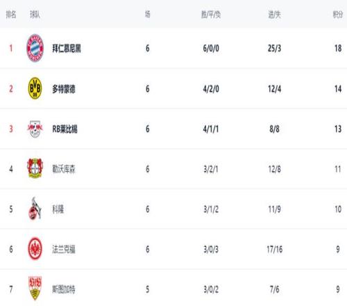 在積分榜上,拜仁6戰(zhàn)全勝,以18分高居榜首,獨(dú)一檔的存在。而這輪丟掉2分的多特蒙德則以14分排名第2。萊比錫13分,排名第3。勒沃庫森3勝2平1負(fù),拿到11分,排名第4??坡∫?0分排名第5。法蘭克福和斯圖加特都是9分,排名第6和第7。