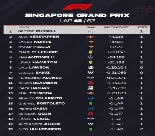 直至最后,維斯塔潘非常強(qiáng)硬的守住了自己的位置!最終,拉塞爾第一個(gè)沖過(guò)終點(diǎn)迎來(lái)格子旗的揮舞,實(shí)現(xiàn)Pole To Win!同時(shí),這也是新加坡站近6年來(lái)的第6位冠軍!維斯塔潘艱難地守住第二獲得亞軍。