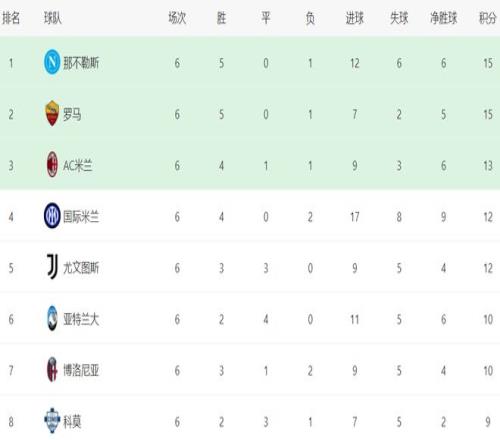在積分榜,榜首易主了。那不勒斯5勝1負(fù),拿到15分,排名榜首。羅馬的戰(zhàn)績(jī)和那不勒斯一樣,也是15分,但凈勝球少,只能排名第2。AC米蘭以13分排名第3。國際米蘭12分,排名第4。尤文圖斯也是12分,凈勝球太少,排名第5。亞特蘭大和博洛尼亞都是10個(gè)積分。