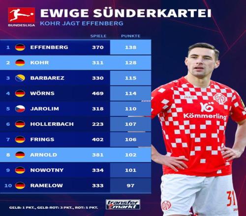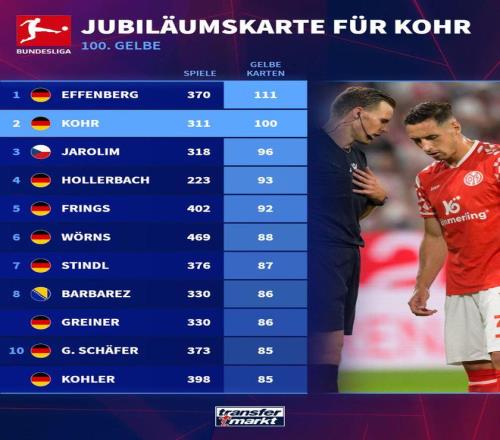 在不久前結(jié)束的德甲第6輪比賽中,美因茨客場(chǎng)0比4慘敗漢堡,而球隊(duì)后防大將多米尼克-科爾在本場(chǎng)比賽中領(lǐng)到一張黃牌,再次登上了德甲歷史榜單。