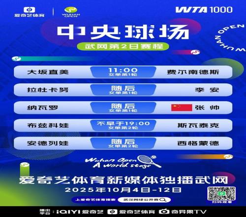 北京時間10月7日,愛奇藝體育新媒體獨播的2025武漢網(wǎng)球公開賽第2日賽程精彩絕倫。