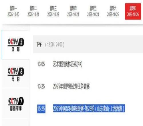 2025賽季中超聯(lián)賽進(jìn)入尾聲階段,爭冠與保級(jí)也進(jìn)入白熱化,北京時(shí)間10月26日下午15:30,中超聯(lián)賽第28輪將上演一場(chǎng)強(qiáng)強(qiáng)對(duì)話,山東泰山坐鎮(zhèn)主場(chǎng)迎戰(zhàn)上海海港!央視體育頻道CCTV5將進(jìn)行現(xiàn)場(chǎng)直播。此外,球迷也可通過五星體育、山東體育頻道以及咪咕視頻等多個(gè)網(wǎng)絡(luò)平臺(tái)觀賽。