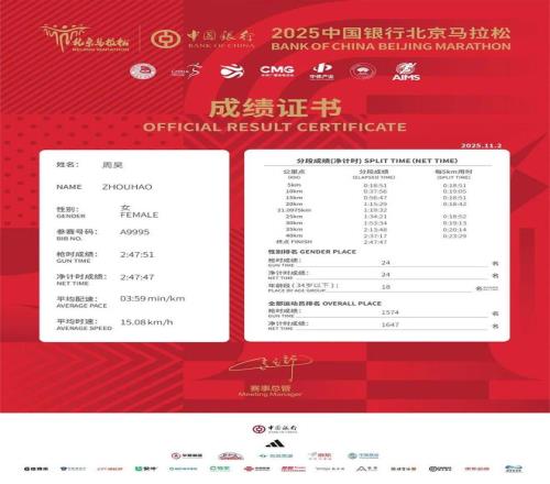 更瘋狂的是拿到冠軍喜提5萬美元的獎(jiǎng)金后,周昊沒有退出隔一天鳴槍起跑的北京馬拉松。而是火速轉(zhuǎn)場(chǎng),從賽場(chǎng)趕到機(jī)場(chǎng),搭乘飛往北京的航班,從機(jī)場(chǎng)地鐵轉(zhuǎn)到入住的酒店已是夜幕降臨。第二天,回到她之前重新達(dá)標(biāo)國家健將的“福地”,以2:47:47完賽。