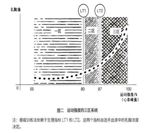 與世界上大多數(shù)耐力訓(xùn)練采用的五區(qū)劃分方式不同,挪威訓(xùn)練法是簡單的三區(qū)劃分,即有氧閾值之下的輕松區(qū)、無氧閾值之上的強(qiáng)度區(qū),以及兩個(gè)閾值之間的混合區(qū)(圖一)。
