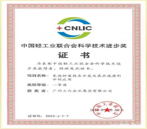 立白衛(wèi)仕長效抑菌技術榮獲“中國輕工業(yè)科技進步獎一等獎”。
